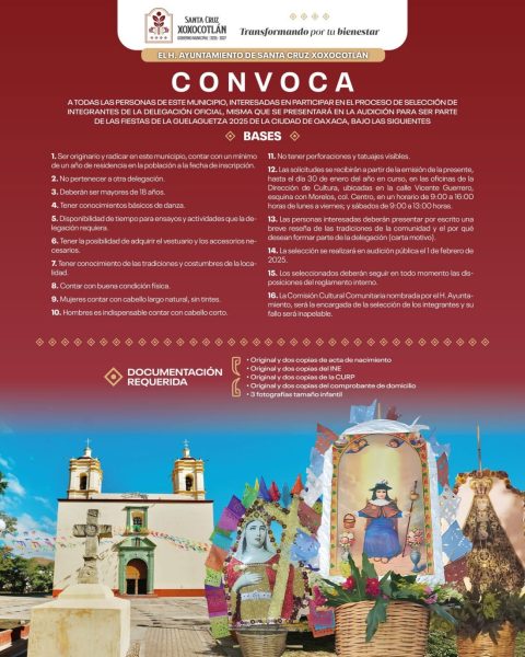 La convocatoria para la selección de la delegación oficial de Santa Cruz Xoxocotlán para la Guelaguetza 2025, está disponible en las redes sociales del gobierno municipal.