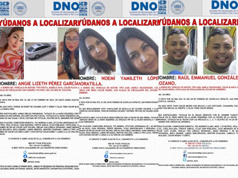 Mientras que, Raúl Emmanuel González Lozano y Noemí Yamileth López Moratilla, fueron vistos por última vez el 28 de febrero de 2025, en la playa de Zipolite, en San Pedro Pochutla.