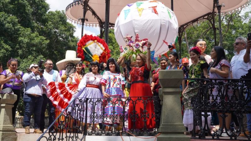 Una vez finalizado su recorrido, un contingente ataviado con vestimentas de las regiones del estado la acompañó entre música y baile hasta el kiosco del zócalo capitalino.