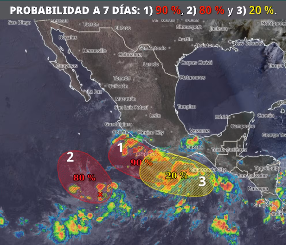 Ciudad de México, a 8 de junio de 2025.- El Servicio Meteorológico Nacional (SMN) ha emitido un nuevo aviso sobre tres zonas de baja presión en el océano Pacífico que presentan diferentes niveles de probabilidad para evolucionar a ciclones tropicales en los próximos días.