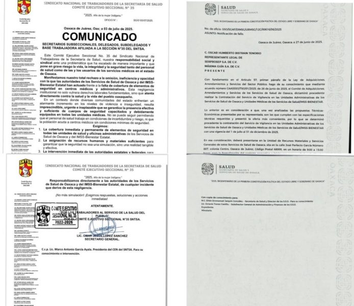 “Manifestamos nuestro total rechazo a la omisión, ineficiencia y opacidad con la que las autoridades de los Servicios de Salud de Oaxaca y del IMSS-Bienestar Estatal han actuado frente a la falta de cobertura de elementos de seguridad en centros médicos y administrativos.