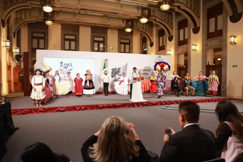 Oaxaca, Oax., 11 de julio de 2025.- Este viernes la herencia ancestral, cultura, color, música y alegría de Oaxaca y su Guelaguetza arribaron a Palacio Nacional, durante la conferencia encabezada por la Presidenta Claudia Sheinbaum Pardo, reafirmando a la entidad como el Corazón cultural y lingüístico de México.