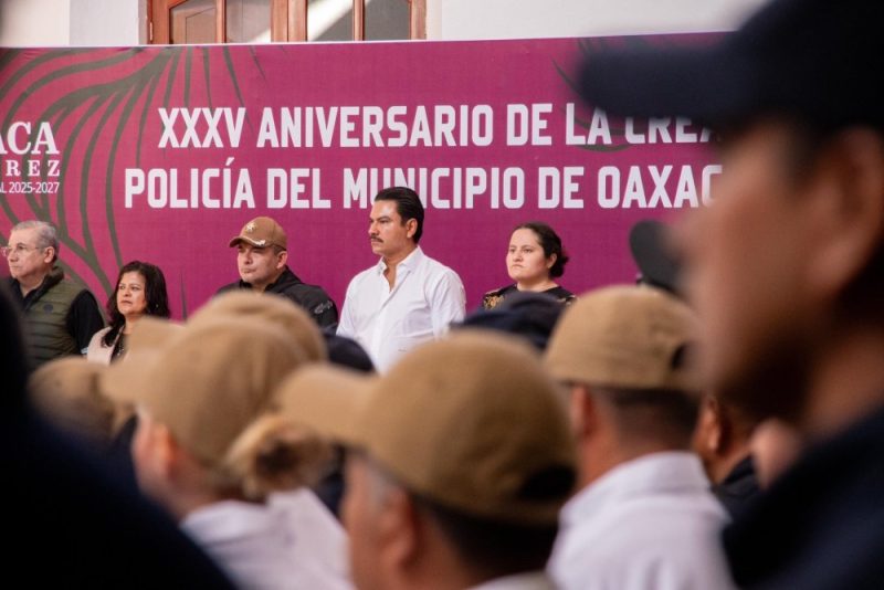 Oaxaca, Oax., a 4 de agosto de 2025.- Con motivo del 35 aniversario de la creación de la Policía Municipal de Oaxaca de Juárez, el presidente Ray Chagoya encabezó la ceremonia conmemorativa donde se reconoció la labor y compromiso de mujeres y hombres que, día a día, protegen a la ciudadanía.