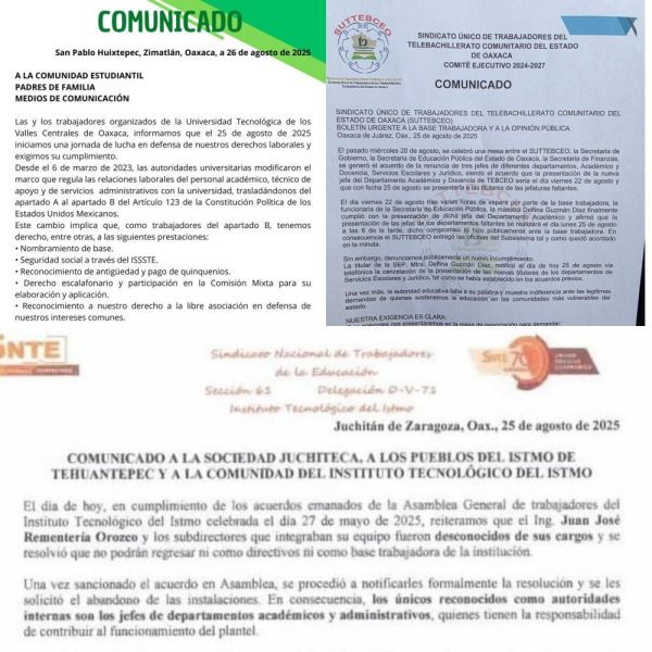 Oaxaca, Oax., a 26 de agosto de 2025.- Debido a la falta de respuestas a sus demandas laborales y el incumplimiento de sus acuerdos sindicales, entre otros motivos, esta semana han surgido o se han agravado los problemas en diversas instituciones educativas públicas del nivel medio superior y superior en el estado de Oaxaca.