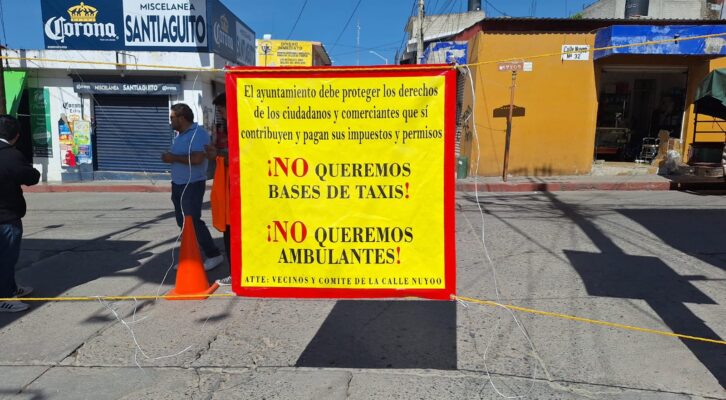 Oaxaca, Oax., a 10 de septiembre de 2025.- Por tercer día consecutivo, ciudadanos y comerciantes mantienen cerrada la calle Indio de Nuyoó, en el centro del municipio de Huajuapan de León, para exigir el retiro de una base de taxistas.