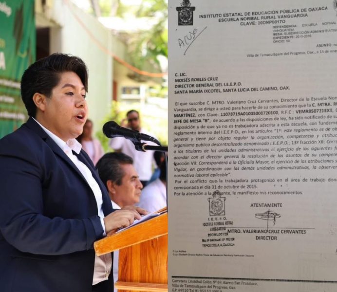 Y es que hay antecedentes de ello: un oficio oficial del Instituto Estatal de Educación Pública de Oaxaca ((EEPO), fechado el 14 de enero de 2016, revela que Vega Martínez fue notificada de su puesta a disposición y dejó de ser trabajadora adscrita a la Escuela Normal Rural Vanguardia.
