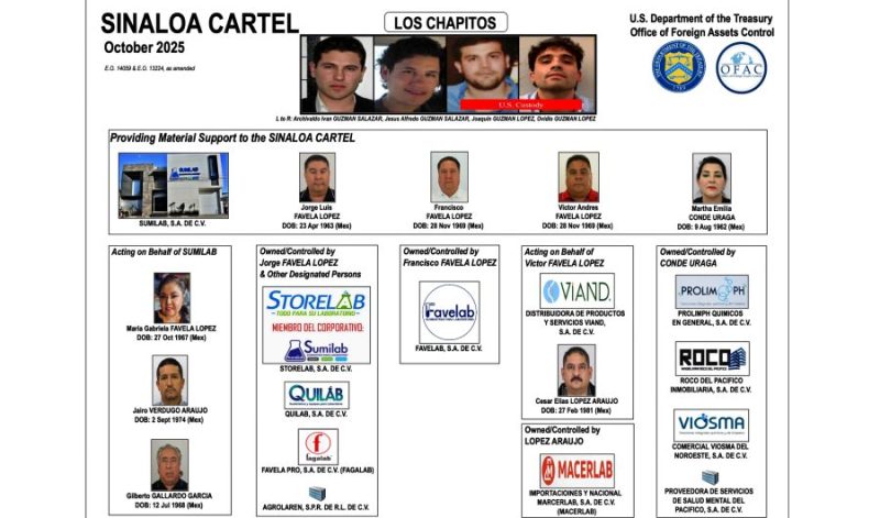 Ciudad de México, a 6 de octubre de 2025.- El Departamento del Tesoro de EE.UU. sancionó este lunes 6 de octubre de 2025 a ocho mexicanos y 12 empresas con sede en México, a quienes señaló por pertenecer al grupo criminal de Los Chapitos, facción del Cártel de Sinaloa.