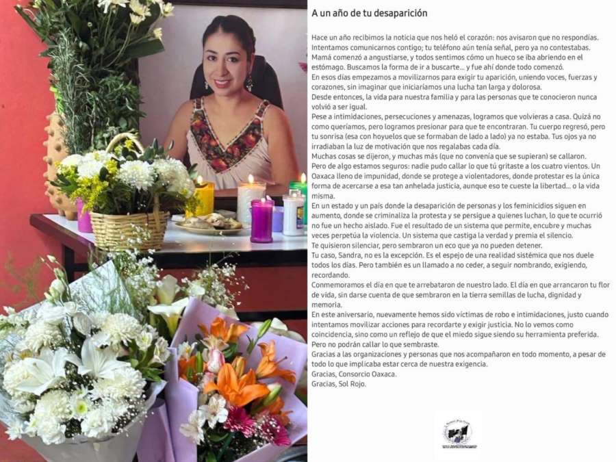 La desaparición y asesinato de Sandra tampoco son hechos aislados, explicó la familia, sino el «resultado de un sistema que permite, encubre y muchas veces perpetúa la violencia. Un sistema que castiga la verdad y premia el silencio», en un país y estado»donde la desaparición de personas y los feminicidios siguen en aumento, donde se criminaliza la protesta y se persigue a quienes luchan».