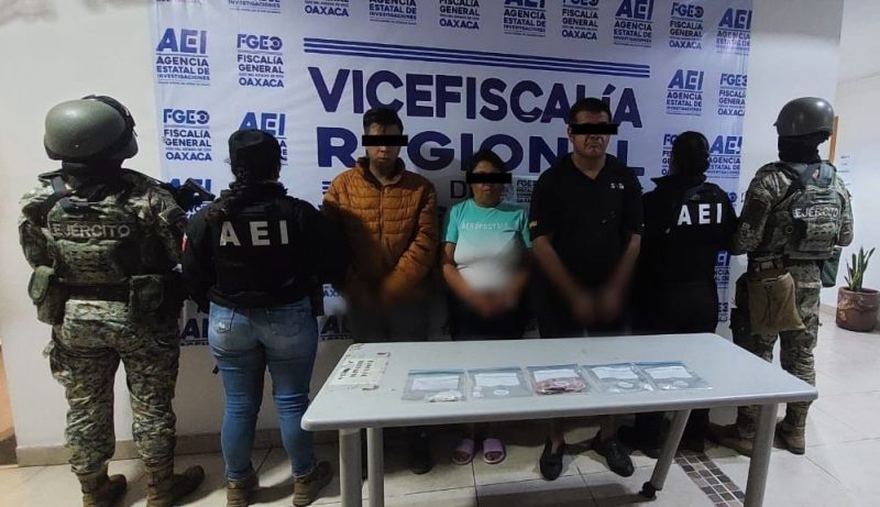 Oaxaca, Oax., a 16 de octubre de 2025.- La Fiscalía General del Estado de Oaxaca (FGEO), en coordinación interinstitucional, dio cumplimiento a una orden de cateo que se realizó de manera coordinada en la zona metropolitana de Oaxaca, logrando la detención de tres personas, dos del sexo masculino y una mujer, integrantes de una célula delictiva dedicada a la venta y distribución de drogas principalmente de San Martín Mexicápam y la colonia Monte Albán, en el municipio de Oaxaca de Juárez.