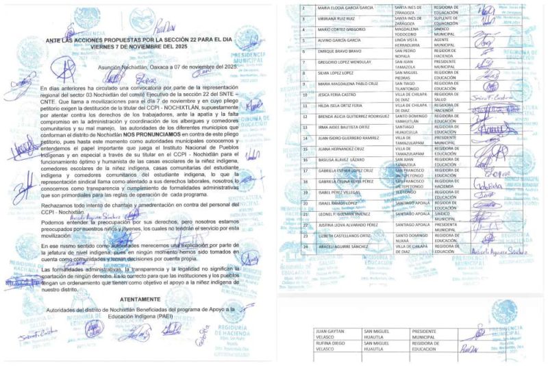 Oaxaca, Oax., a 8 de noviembre de 2025.- Autoridades de varios municipios del distrito de Nochixtlán negaron los señalamientos de la Sección 22 del magisterio oaxaqueño en contra de la titular del Centro Coordinador de Pueblos Indígenas (CCPI), Itayeé Cruz Guevara, por presuntamente atentar contra los derechos de los trabajadores y tener un mal manejo de comedores comunitarios y albergues escolares.
