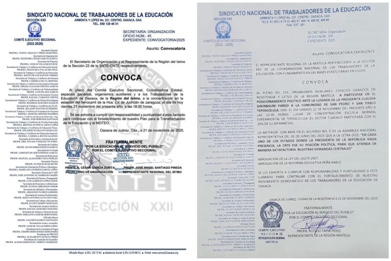 Oaxaca, Oax., a 21 de noviembre de 2025.- La dirigencia de la Sección 22 del Sindicato Nacional de Trabajadores de la Educación (SNTE) convocó de manera urgente a una concentración masiva en las actividades que tendrá hoy y mañana la Presidenta de México, Claudia Sheinbaum, en la entidad oaxaqueña.
