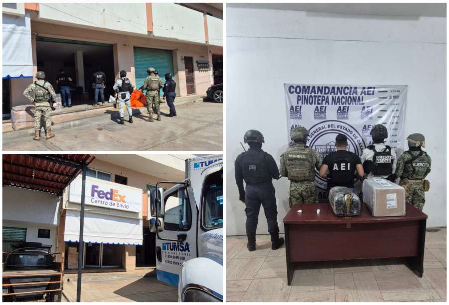Como resultado del primer operativo, realizado en un establecimiento de paquetería ubicado en la colonia Aviación, se aseguró un paquete enviado desde la ciudad de Oaxaca con destino a la población de Mancuernas, perteneciente a Santiago Pinotepa Nacional, el cual contenía hierba seca con características de la marihuana, así como cocaína y cristal.