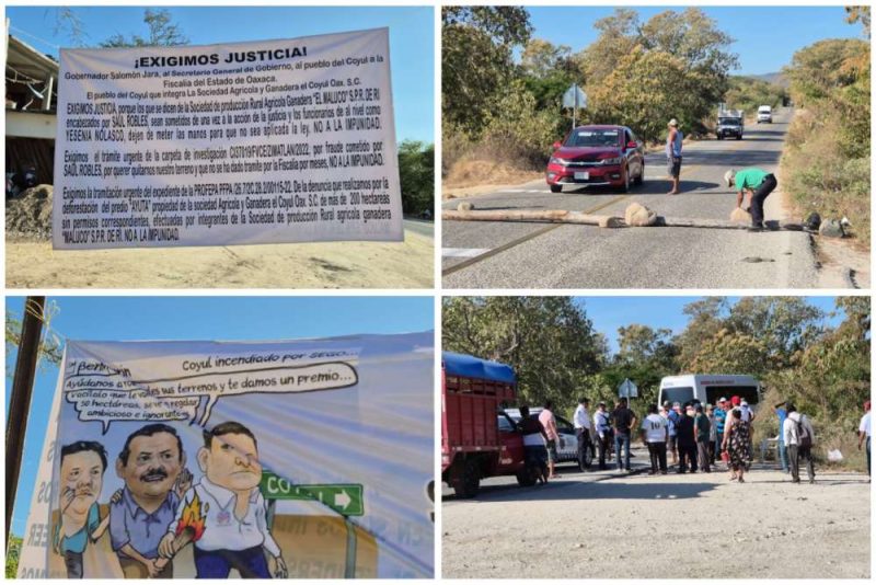 Oaxaca, Oax., a 15 de diciembre de 2025.- Integrantes de la Sociedad Agrícola y Ganadera “El Coyul Oax” S. C. bloquearon la carretera costera en la comunidad de El Coyul para exigir a las autoridades dar celeridad a los juicios en contra de un grupo de pobladores que usurpó la titularidad de la organización con la intención de despojarlos de más de mil hectáreas de terreno.