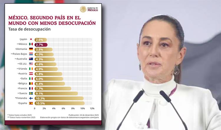 Ciudad de México, a 27 de diciembre de 2025.- La Presidenta de México, Claudia Sheinbaum, festejó este viernes que el país está por cerrar el año como el segundo con menos desempleo en el mundo, con una tasa de desempleo del 2.7 por ciento, tan solo detrás de Japón, con el 2.6 por ciento.