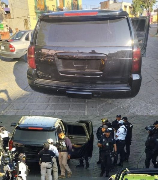 A las 08:38 horas, elementos de la Policía Municipal interceptaron y aseguraron una camioneta marca Chevrolet Tahoe, color negro, con vidrios polarizados y sin placas de circulación. La unidad presenta impactos de arma de fuego en la puerta del conductor.