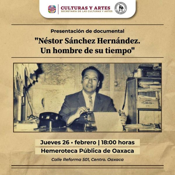 Oaxaca de Juárez, Oax., 26 de febrero de 2026.- La Secretaría de las Culturas y Artes de Oaxaca (Seculta) invita a la proyección gratuita del documental “Néstor Sánchez Hernández – Un hombre de su tiempo”, que se realizará este jueves a las 18:00 horas en la Hemeroteca Pública que lleva su nombre, ubicada en el Centro Cultural Santo Domingo.