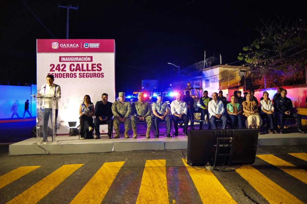 Oaxaca, Oax., a 1 de marzo de 2026.- Como parte del programa “Oaxaca Segura”, el gobernador Salomón Jara Cruz inauguró 242 calles intervenidas con iluminación, botones de auxilio y videovigilancia, que las transforman en Senderos Seguros, para que la población pueda transitar con mayor confianza y reducir considerablemente los riesgos de delitos, violencias, acoso o accidentes.