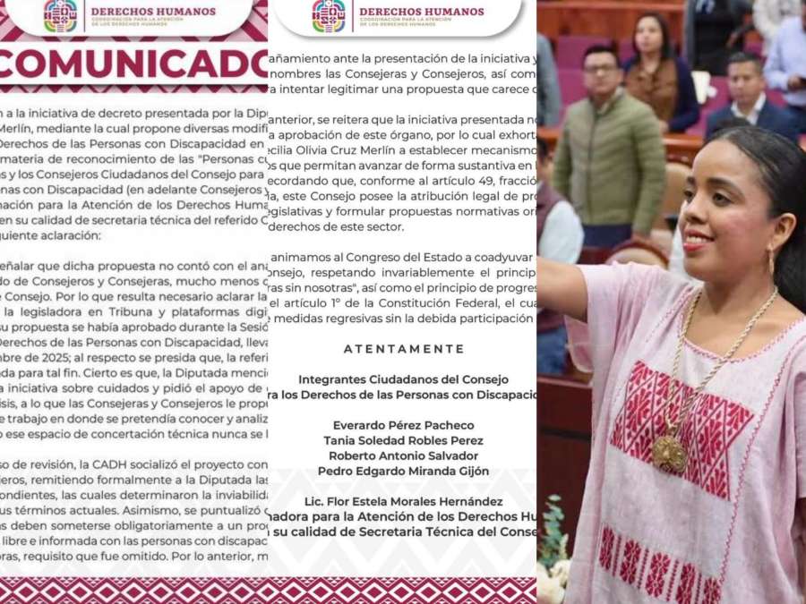 Oaxaca, Oax., a 14 de marzo de 2026.- El Consejo para los Derechos de las Personas con Discapacidad y la Coordinación para la Atención de los Derechos Humanos (CADH) del estado de Oaxaca rechazaron haber otorgado su apoyo a la propuesta de la diputada Cecilia Olivia Cruz Merlín para modificar la Ley de los Derechos de las Personas con Discapacidad en el Estado de Oaxaca, en materia de reconocimiento de las «personas cuidadoras no formales». Esto debido a falta de consulta y porque la propuesta es inviable «en sus términos actuales».