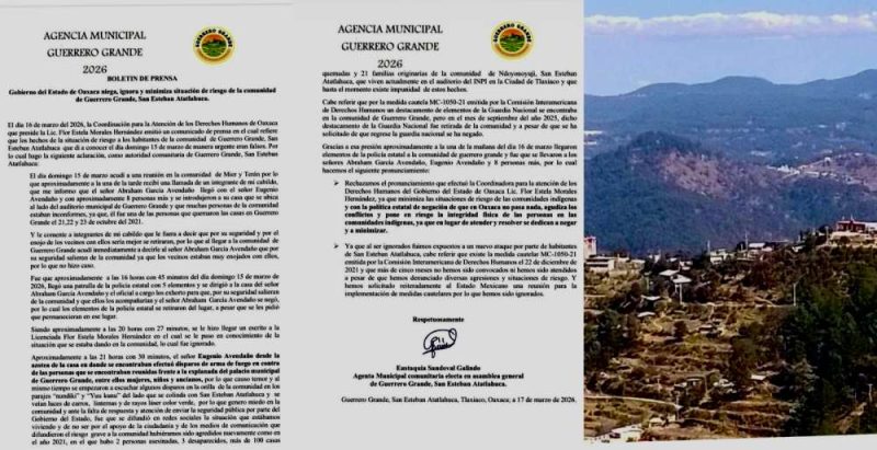 Oaxaca, Oax., a 18 de marzo de 2026.- La autoridad auxiliar de Guerrero Grande, municipio de San Esteban Atatlahuaca, refutó a la Coordinación de Derechos Humanos del Gobierno de Oaxaca, que aseguró que no hubo ataques armados el pasado 15 de marzo.