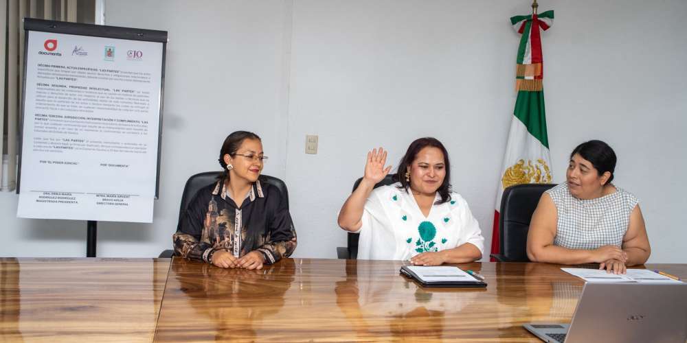 Oaxaca, Oax., a 7 de abril de 2026.- En un acto protocolario realizado en modalidad virtual, la titular del Poder Judicial del Estado, magistrada Erika María RodríguezRodríguez y la directora de Documenta, Asociación Civil, María Sirvent Bravo Ahuja, firmaron un Convenio de Colaboración con el objetivo de fortalecer la impartición de justicia con enfoque en derechos humanos y compromiso social.