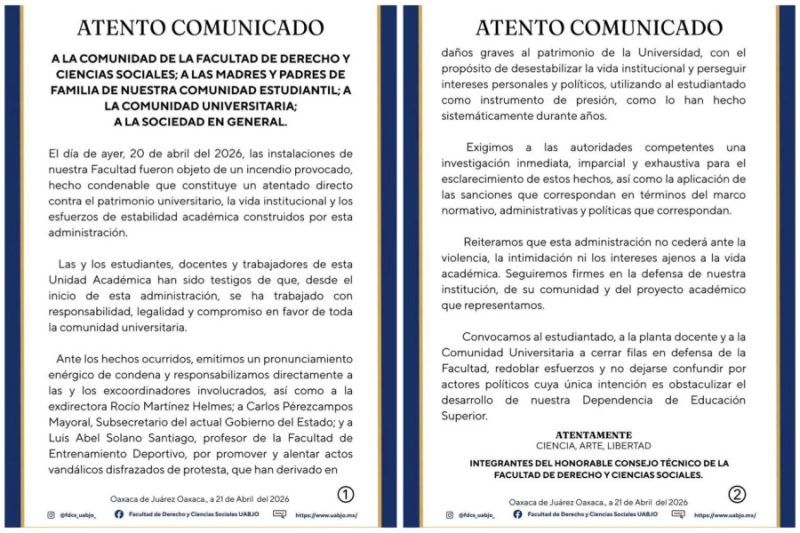 Oaxaca, Oax., a 21 de abril de 2026.- El Consejo Técnico de la Facultad de Derecho y Ciencias Sociales de la Universidad Autónoma «Benito Juárez» de Oaxaca (UABJO) responsabilizó a funcionarios del gobierno de Oaxaca del incendio ocurrido anoche en su sede de Ciudad Universitaria.