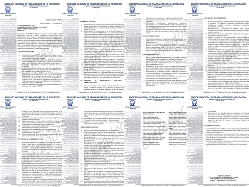 En un borrador del documento, el comité ejecutivo seccional 2022-2026, que encabeza Yenny Araceli Pérez Martínez, también incluye exigencias para la seguridad social de sus agremiados y freno a los megaproyectos, así como aumento de los recursos del ramo 33 para los 570 municipios del estado, que permita resolver necesidades educativas.